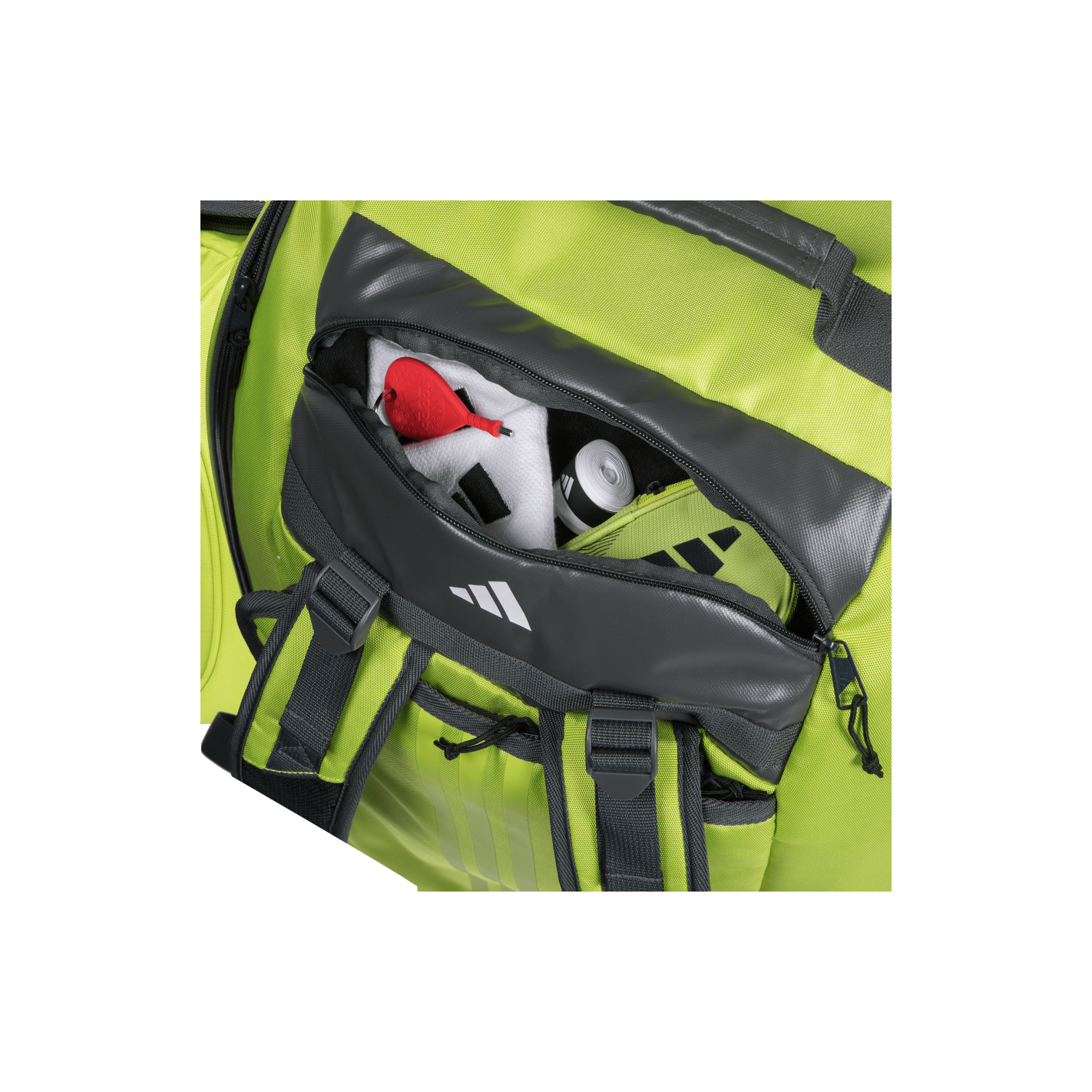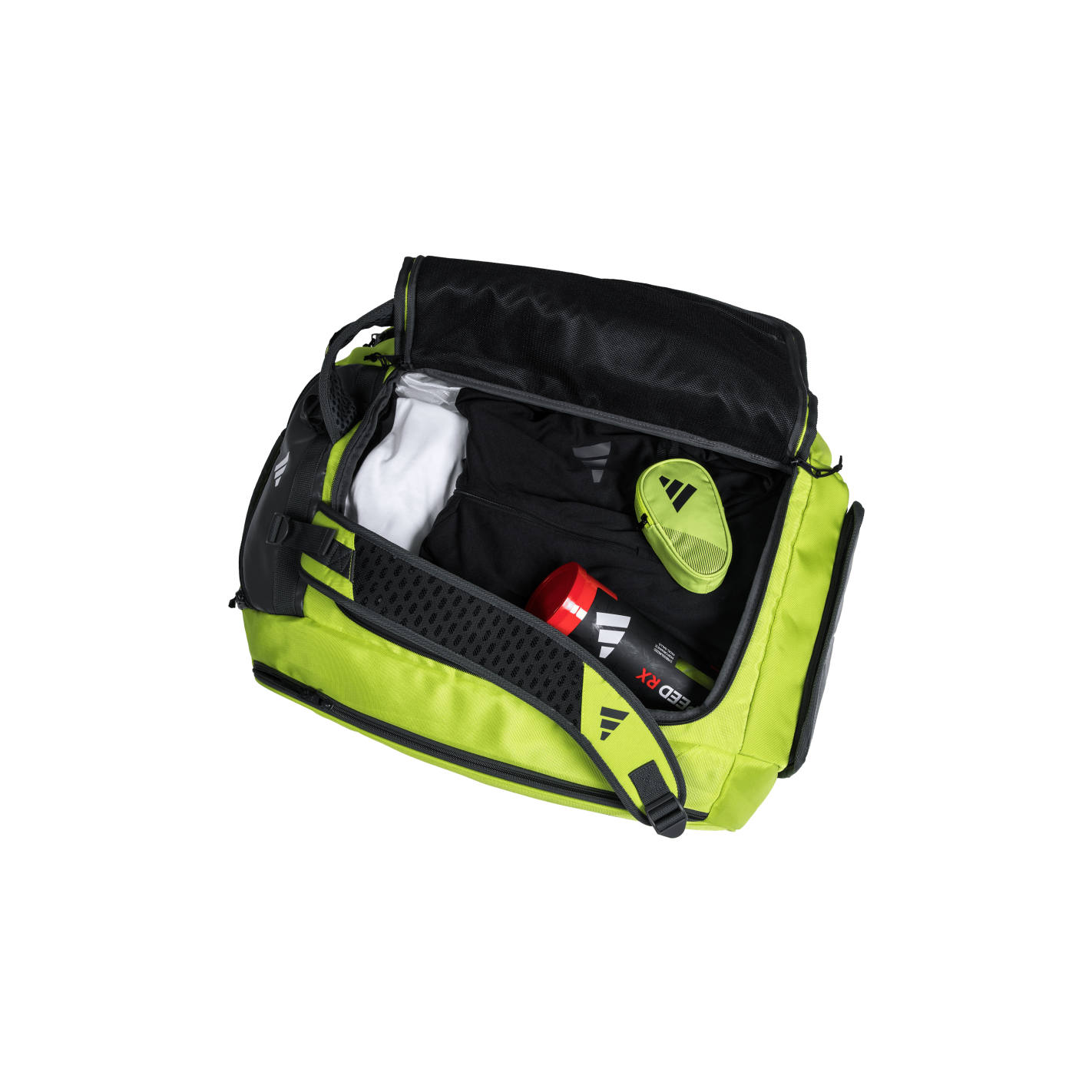 The innovative design of the racket bag allows you to place all your padel equipment in different spaces. Everything has its place. It has a large main compartment for clothing and other game components. On the sides, there are thermally insulated pockets to place the rackets with the best guarantee that they are safe. The lower part is designed for shoes, thanks to the mesh that allows ventilation. At the top of the bag is a pocket for smaller items.