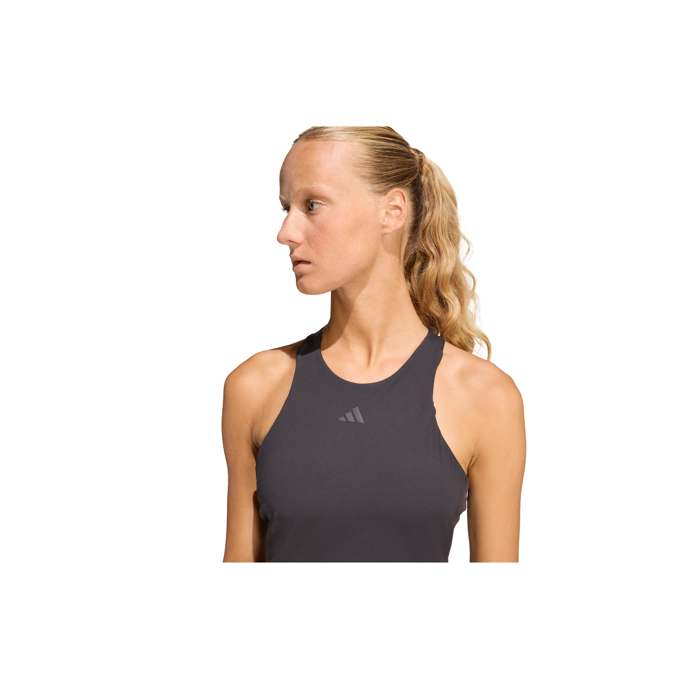 Slim athletic silhouette; updated Y-strap back construction; shaped armholes for full shoulder mobility; integrated bra with seamless removable pads; performance logo at chest