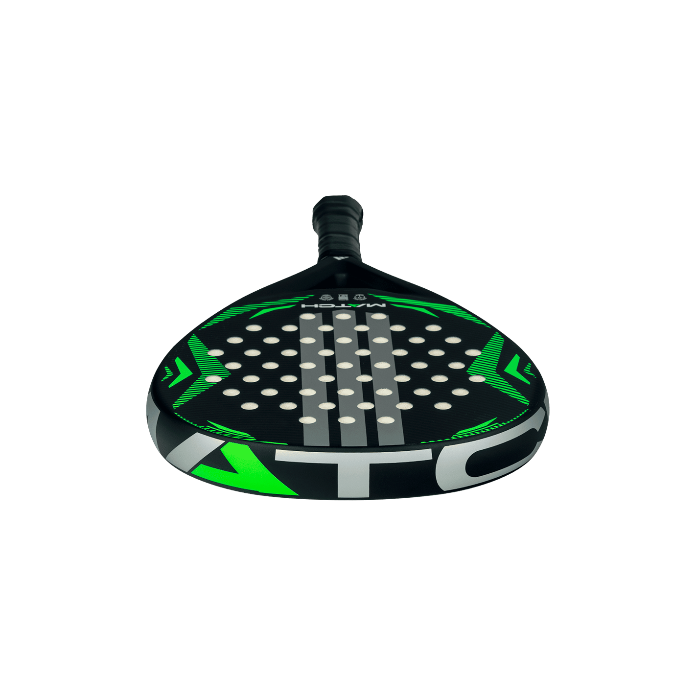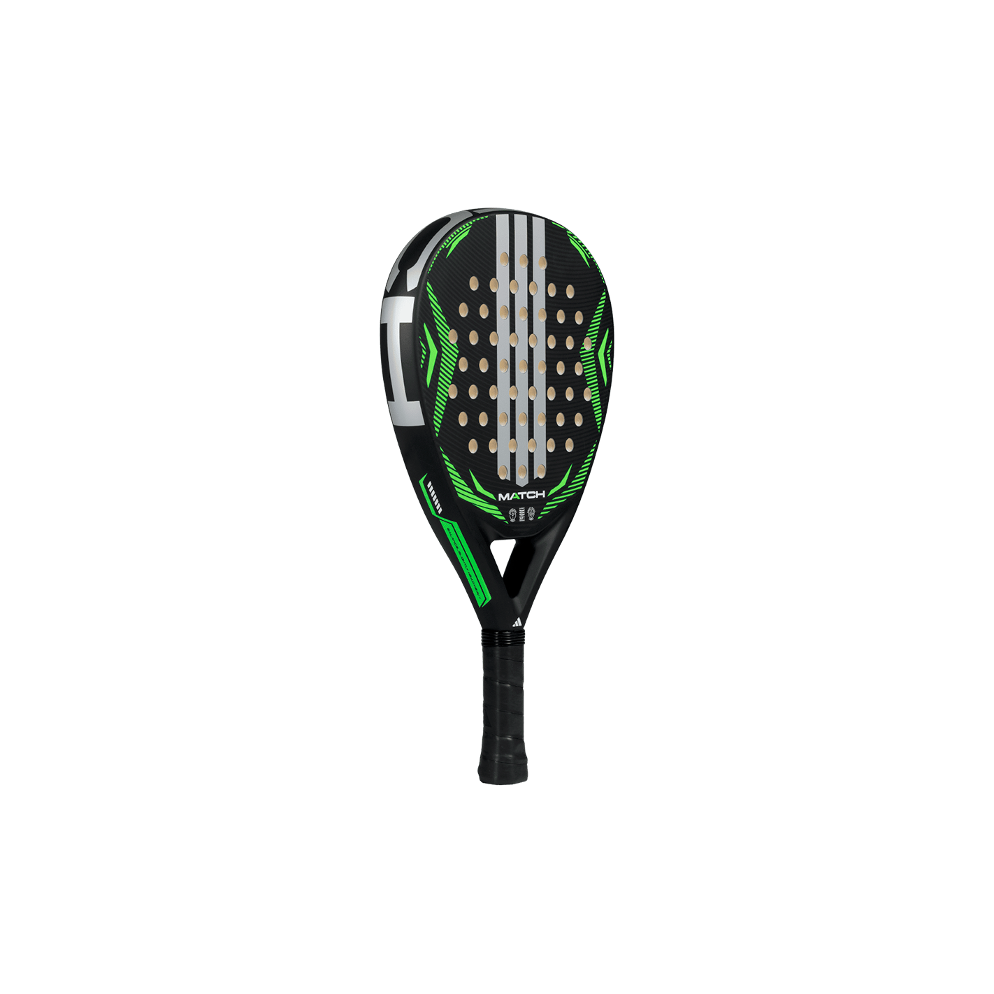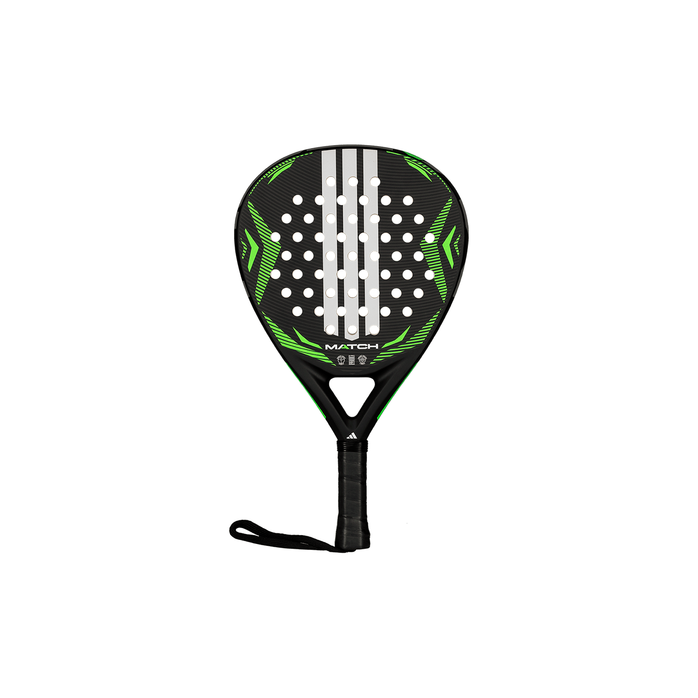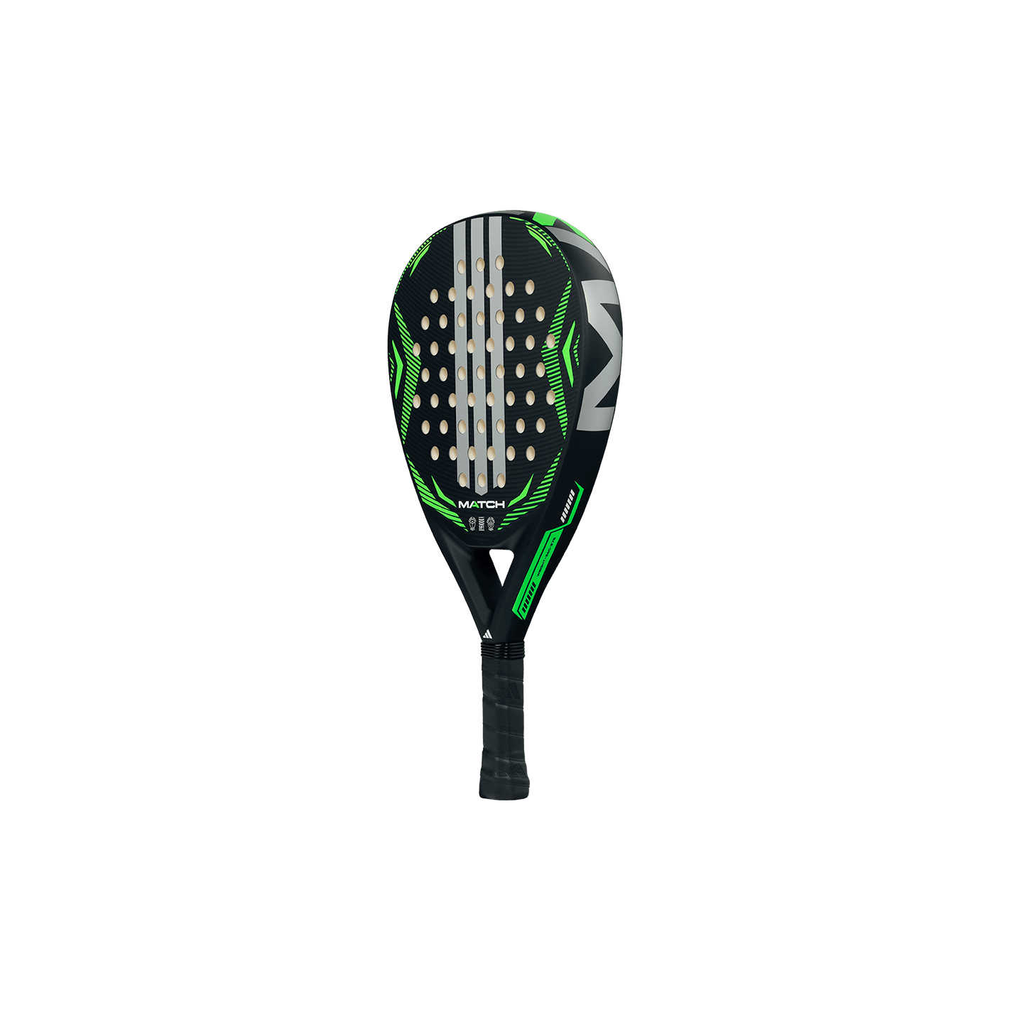 Discovery-level versatility and durability. The adidas Match black lime 2026 padel racket features an ALLROUND (hybrid) shape, Fiber Glass surface, and Soft Performance EVA core, optimized for reliable handling and comfort in beginner play. Structural integrity is ensured by STRUCTURAL REINFORCEMENT.